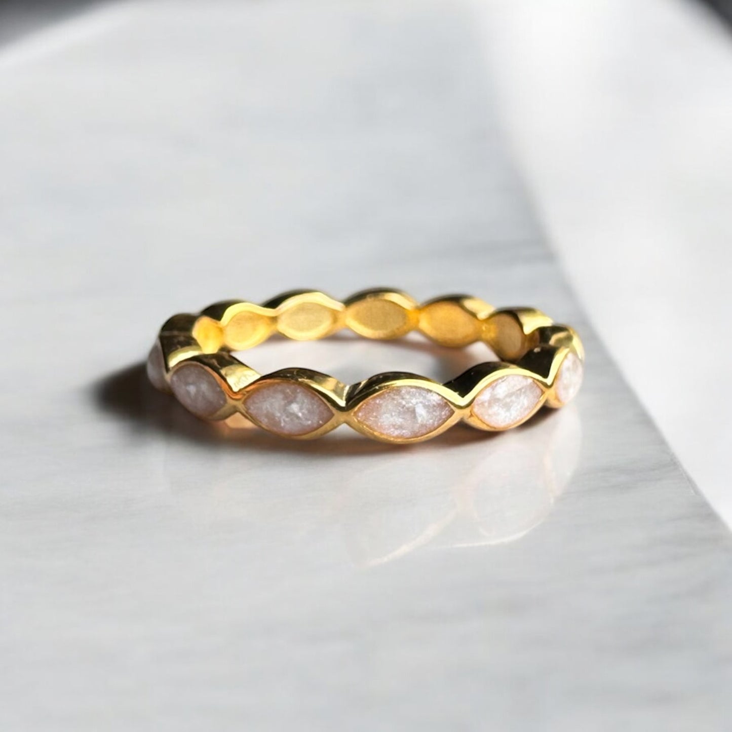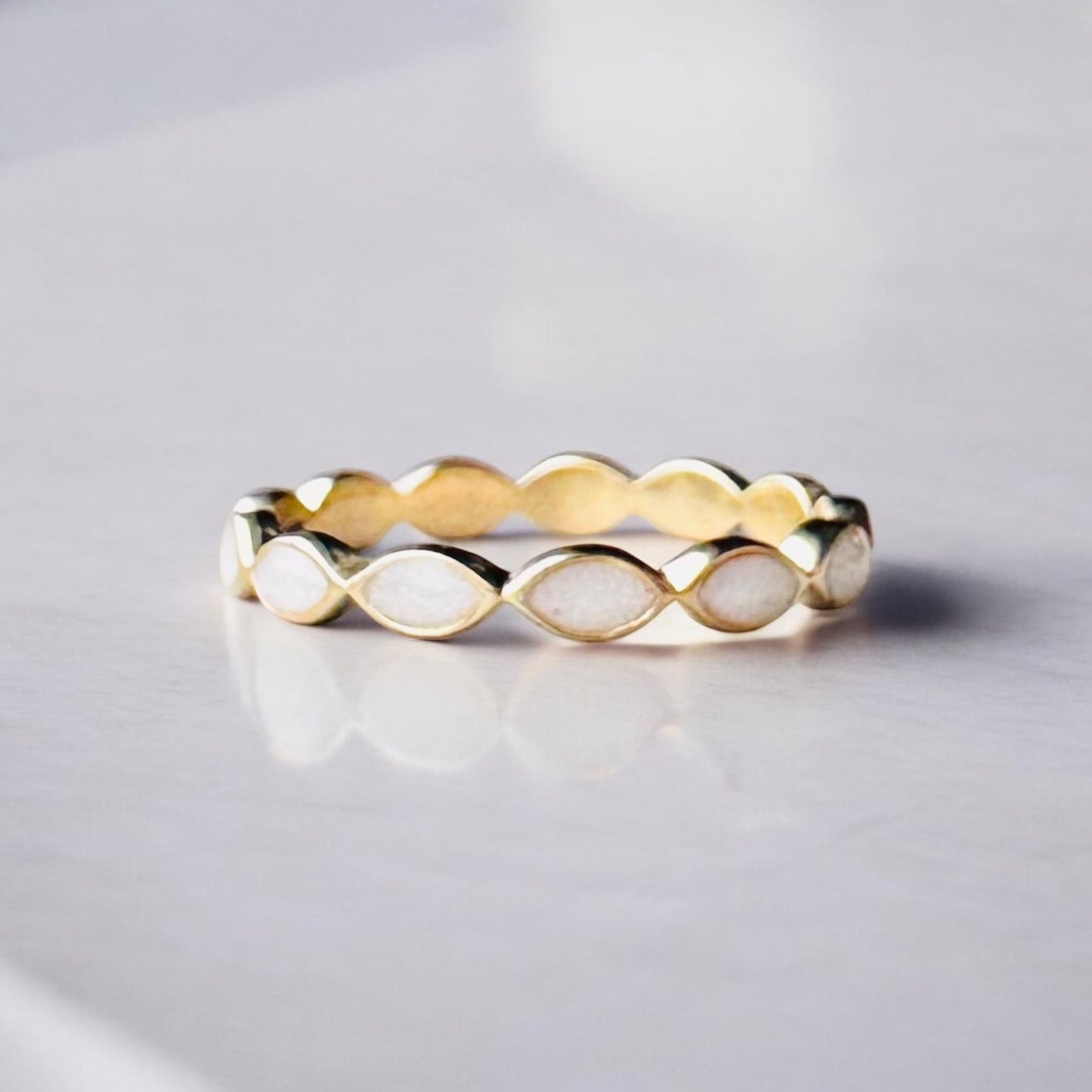 A breathtaking and elegant keepsake, this 9K Yellow, White, or Rose Gold Full Eternity Ring is designed to preserve your most cherished memories. Featuring almond-shaped marquise stones that wrap all the way around the band, this stunning piece holds breastmilk, ashes, umbilical cord, hair, fur, or a custom inclusion—creating a truly meaningful tribute.