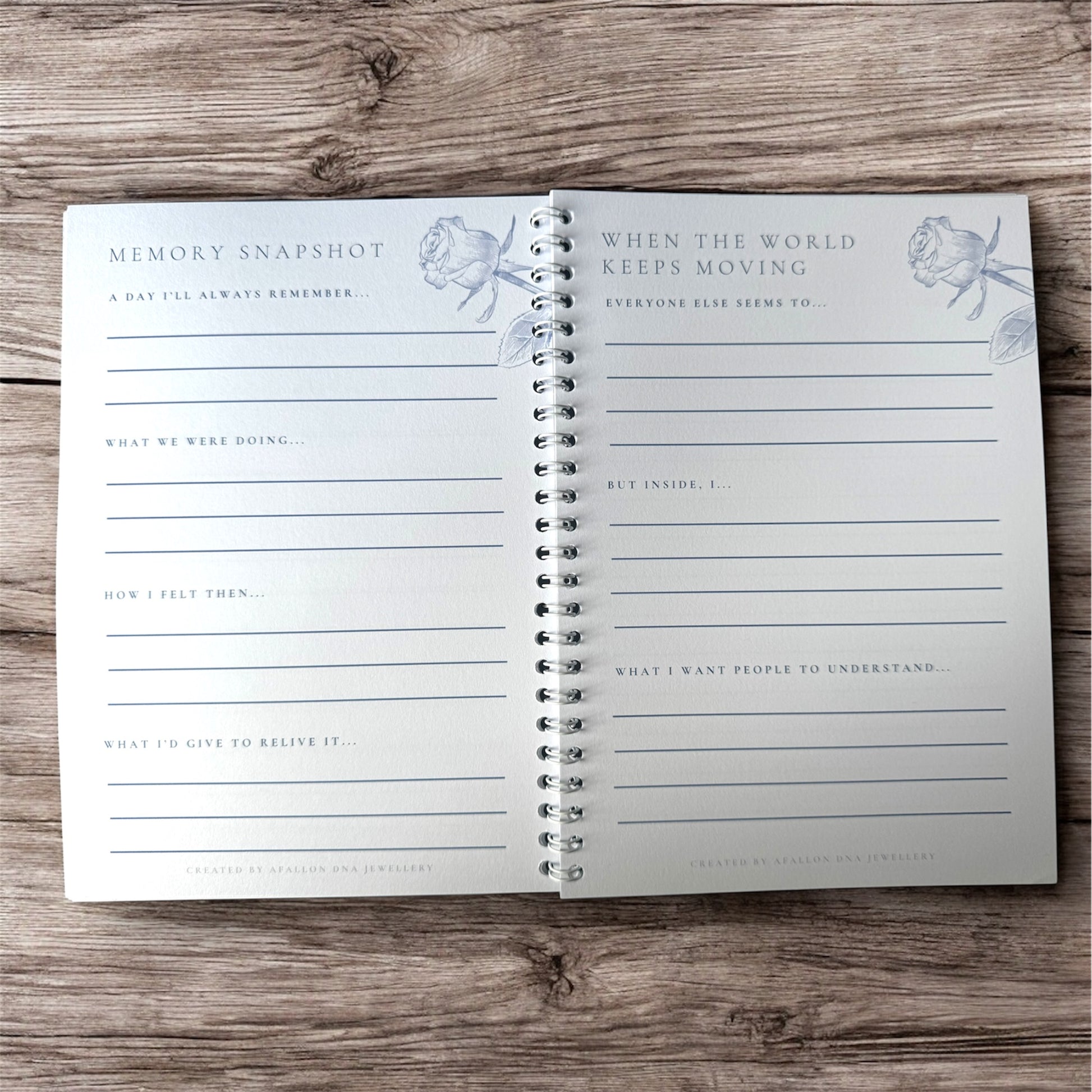 This A5 wire-bound grief journal was created to offer comfort during life’s most painful moments. With softly guided prompts, affirmations, and space for reflection, it’s a private place to carry your love and your grief — whether your loss is recent or something you’ve carried for years.