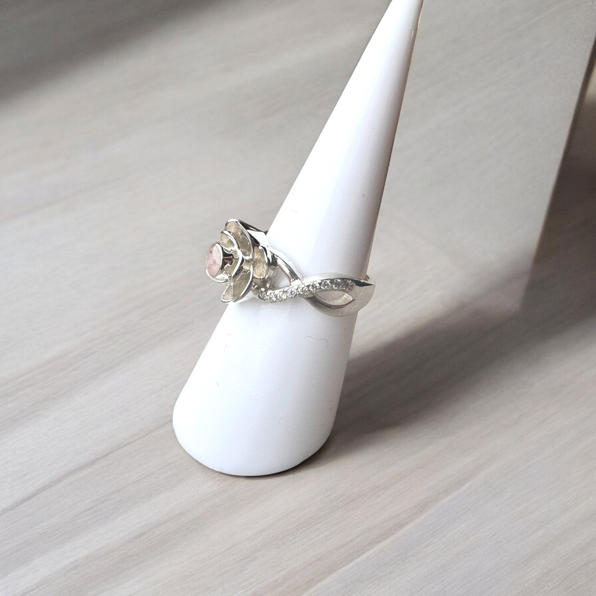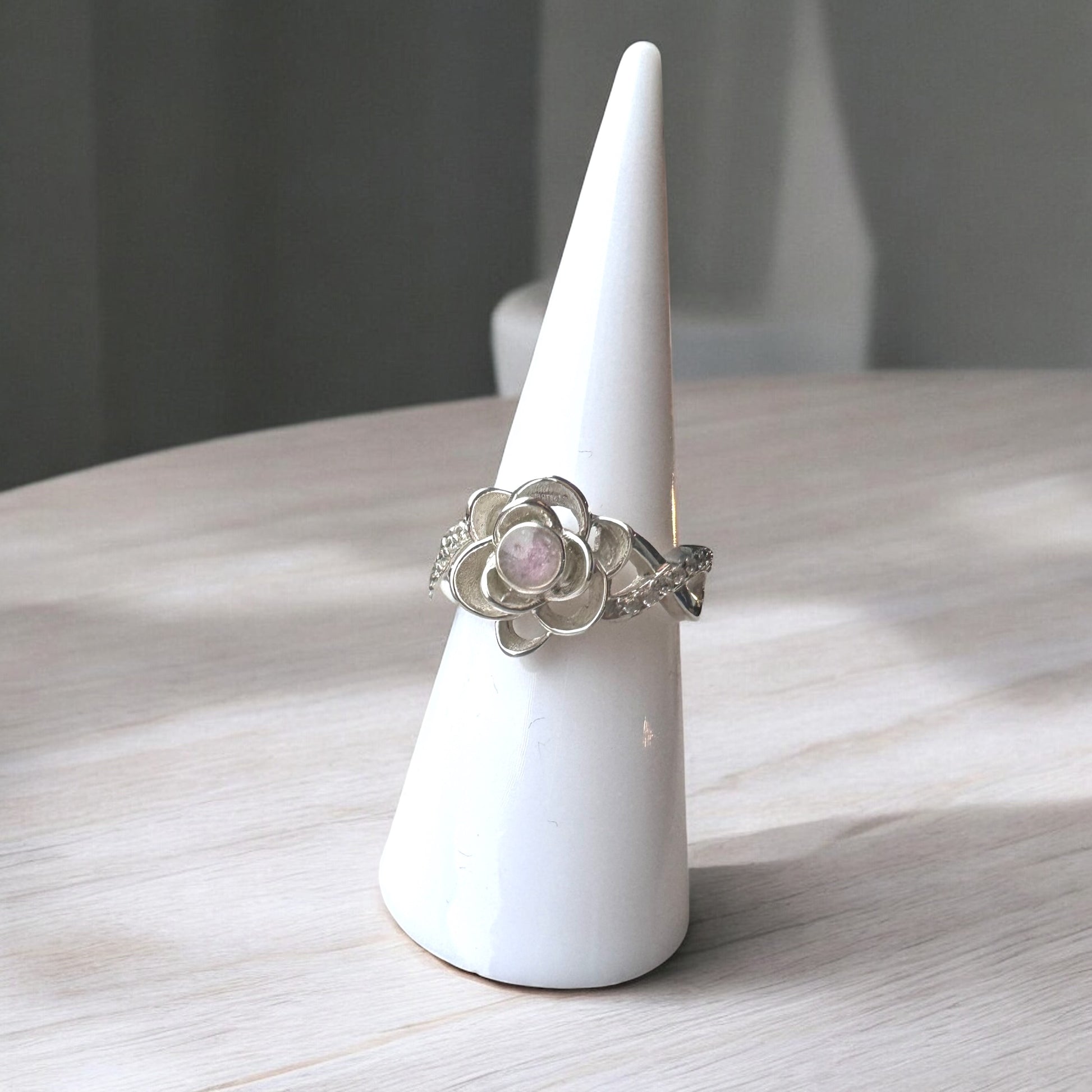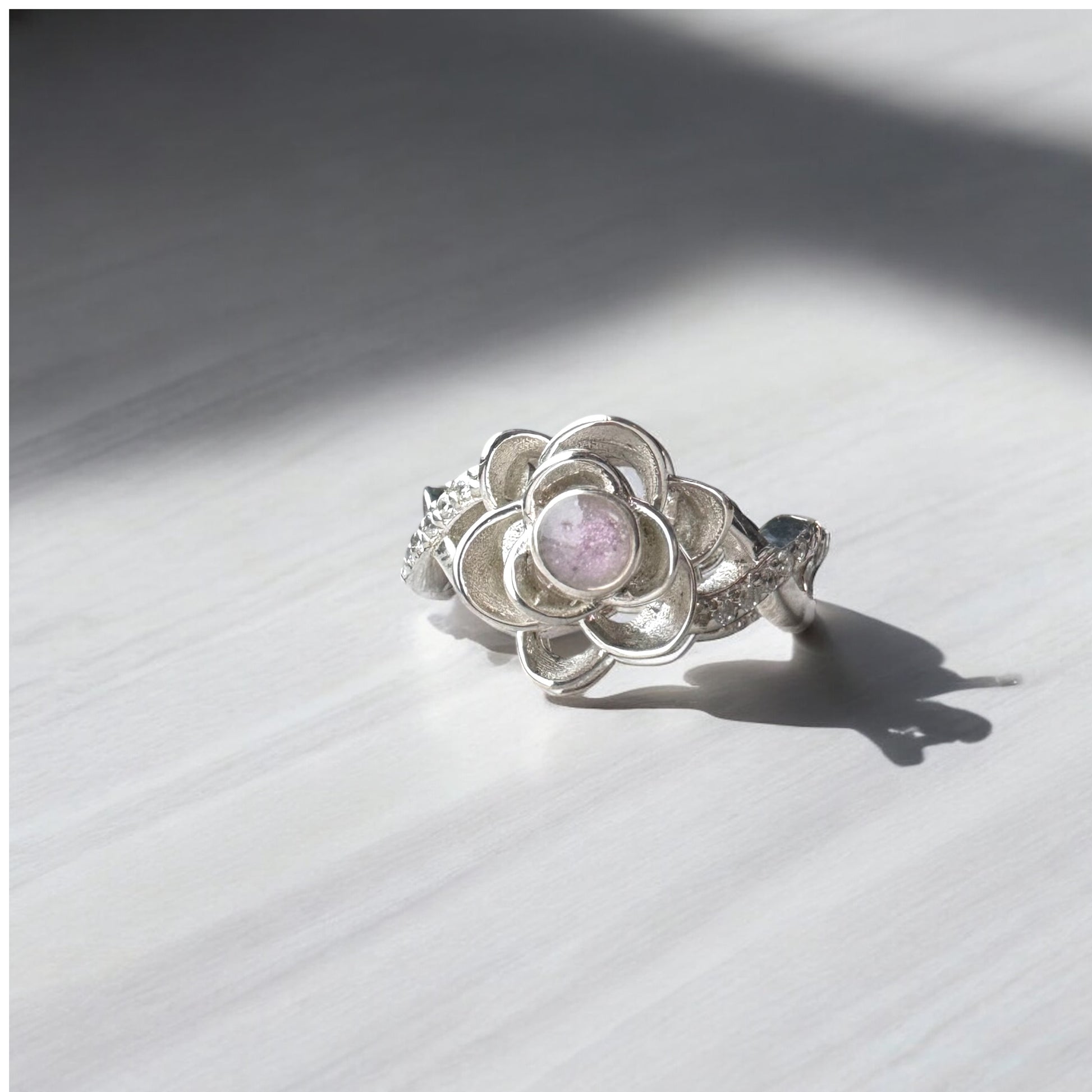 This beautiful and eye-catching rose-inspired ring features your chosen inclusion, delicately set at the centre of a 9K rose gold flower with a Sterling Silver band. A truly elegant and meaningful piece, designed to hold your most cherished memories.